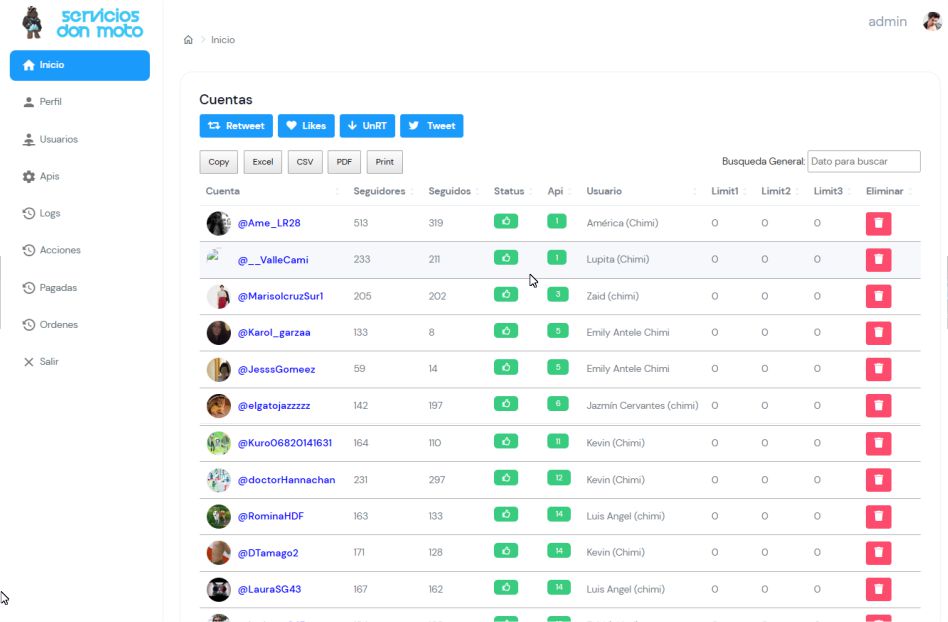En mi trabajo en Servicios Don moto, lideré y desarrollé en su totalidad el panel de automatización de Tweets utilizando diversas tecnologías y herramientas.